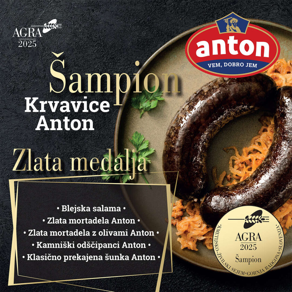 Največ pozornosti je požel naziv Šampion AGRA 2025, ki ga je prejel izdelek krvavice Anton. Poleg tega so zlate medalje na mednarodnih ocenjevanjih dobili še izdelki zlata mortadela Anton, zlata mortadela Anton z olivami, blejska salama, klasično prekajena šunka Anton ter kamniški odščipanci.