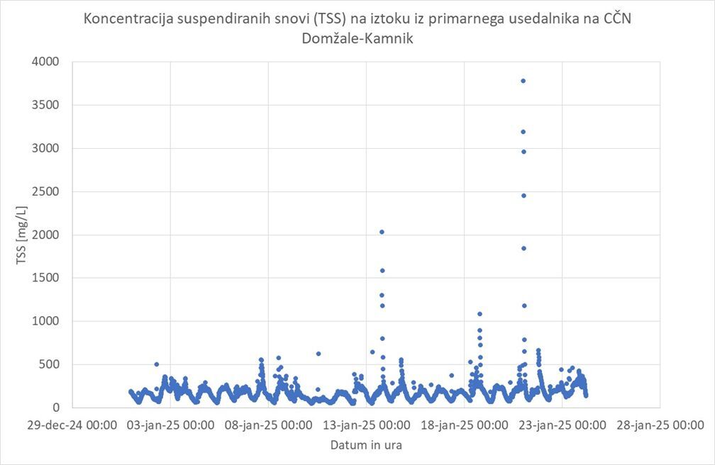 »Nenavadno povečanje količine suspendiranih snovi smo prvič opazili v drugem tednu letošnjega leta, te količine pa so se do danes koncentracijsko le še povečevale,« poudarja direktorica dr. Marjetka Levstek in pojasnjuje: »Meritve z on line merilno sondo so na iztoku iz mehanske stopnje večkrat pokazale koncentracijo nad 400 mg/L, medtem ko se običajne vrednosti za komunalno odpadno vodo gibljejo med 60 in 300 mg/L. Na CČN smo s 6 meritvami v zadnjih dveh tednih v januarju ugotovili, da so se presežene vsebnosti suspendiranih snovi nenehno povečevale in so 21. januarja dosegale celo 3.700 mg/L. Z vzorčenjem in analiziranjem vzorcev odpadne na vtoku in merilnemu mestu med občinama Domžale in Kamnik je bilo dokazano, da odpadna voda prihaja iz Občine Kamnik in da so koloidne suspendirane snovi anorganskega izvora. Povečana količina anorganskih snovi v odpadni vodi povzroča negativni vpliv na delovanje biološkega čiščenja organskih snovi in posledično lahko vpliva na učinkovitost čiščenja. Čistilne naprave so namenjene čiščenju organskih snovi, dušika in fosforja, anorganske suspendirane snovi pa je treba pred iztokom v kanalizacijo izločiti na mestu nastanka. Koncentracija na iztoku v kanalizacijo ne sme presegati mejne vrednosti, dogovorjene z upravljavcem kanalizacije in čistilne naprave, ta pa običajno znaša do 250 mg/L. Ocenjen čas izlitja v kanalizacijo, še preden smo ga zaznali na lokaciji CČN, je bil med 5 in 7 ur. Z vzorčenjem nadaljujemo po posameznih kanalizacijskih vejah v občini Kamnik. Prav tako so v sredo, 22. januarja, v KP Kamnik na nekaj lokacijah že pregledali kanalizacijo po različnih vejah. Nadejamo se, da bomo po vzorčenju na terenu potencialnega onesnaževalca lahko tudi identificirali.«