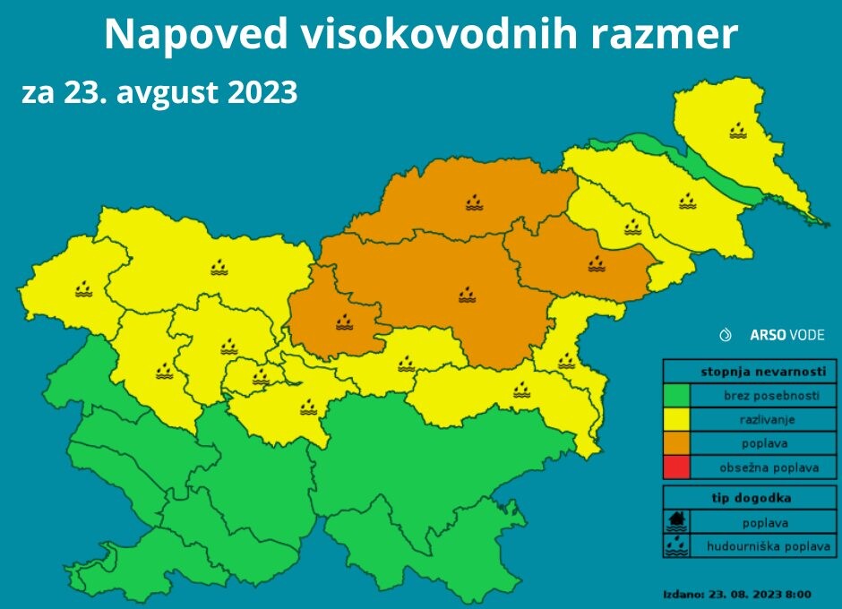 Iz Meteoinfo sporočajo, da bo težišče nevihtnega dogajanja, v severni polovici Slovenije, kjer lahko lokalno v kratkem času pade več kot 30 litrov dežja na kvadratni meter, zato lahko močneje narastejo in poplavijo posamezni potoki in hudourniki. Iz Arsa se sporočajo, da so možna poplavljanja padavinske in zaledne vode, predvsem na območjih, kjer so bile avgustovske poplave. Izdano je tako tudi oranžno opozorilo za poplave.