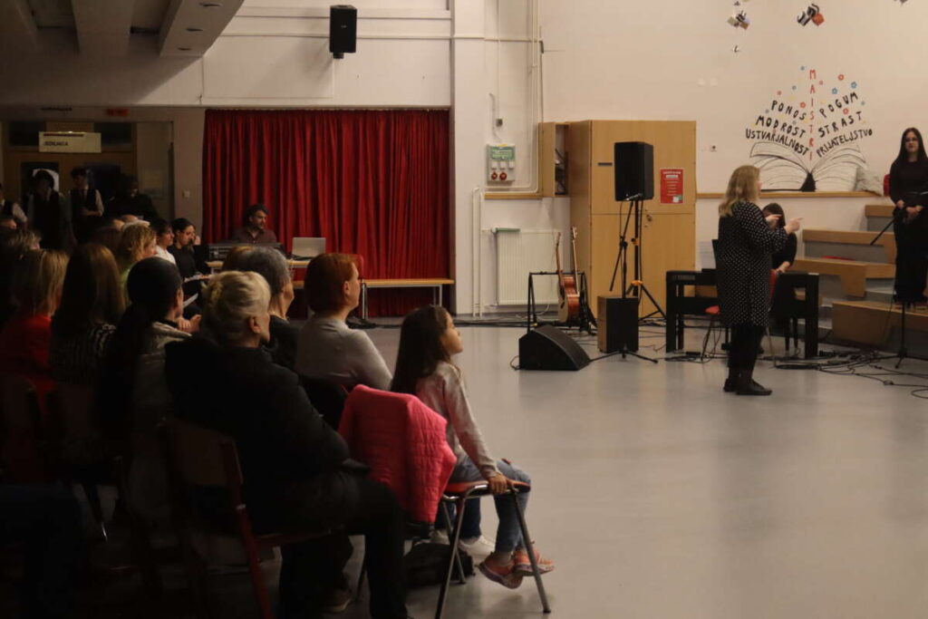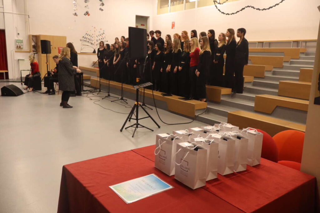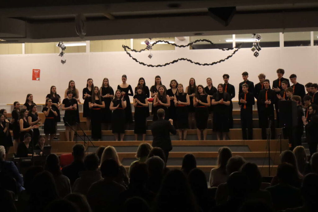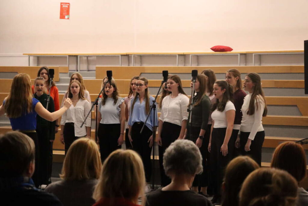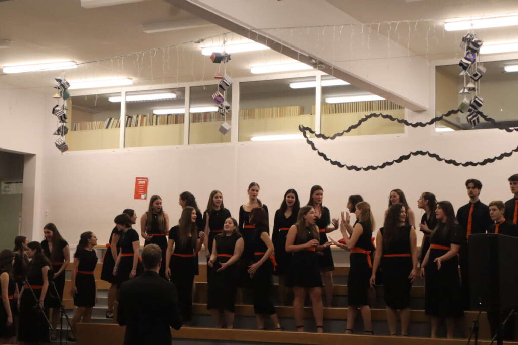 Gimnazijo Škofja Loka sta zastopali dve zasedbi pod taktirko Eve Jekovec in Žiga Kerta. Dekliški pevski zbor, ki ga sestavljajo predvsem dijakinje prvega letnika pod vodstvom Eve Jekovec je izvedel angleške pesmi Feel Good, Bring Me Little Water, Silvy in ritmično Sing, Sing, Sing!