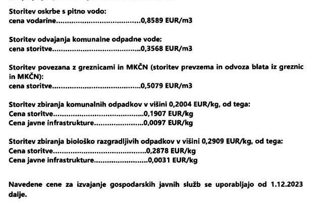 Znesek računa za komunalne storitve je odvisen od porabe vode in velikosti zabojnikov za odpadke. Za povprečno gospodinjstvo je mesečna položnica z uveljavitvijo novih cen višja za približno 4,5 evra.