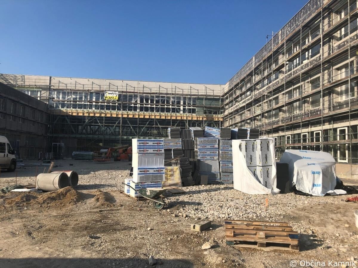 Na ovoju stavbe se po zaključeni izvedbi sloja nadaljuje z namestitvijo končne fasadne obloge. V teku so tudi pripravljalna dela za izvedbo zunanje ureditve.