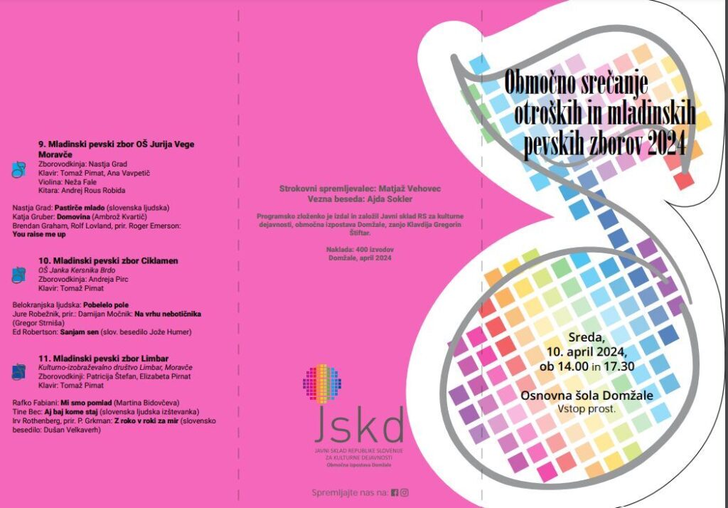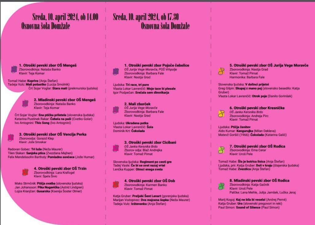 V sredo bodo na oder Osnovne šole Domžale stopili pevci in pevke devetnajstih otroških in mladinskih pevskih zborov iz osnovnih šol iz območja, ki ga pokriva JSKD OI Domžale, se pravi iz občin Domžale, Trzin, Mengeš, Moravče in Lukovica. Nastopili bodo v dveh sklopih, prvi ob 14. uri in drugi ob 17.30.