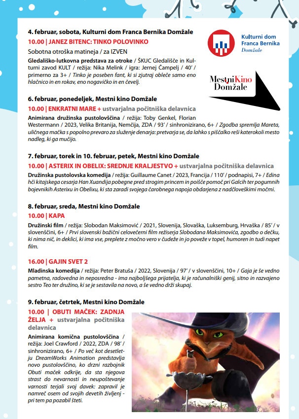 V Smučarskem društvu Domžale organizirajo 4-dnevni smučarski tečaj v Kranjski Gori. Svoje tečaje imajo tudi v ŠD Fan Vit, in sicer v Bodentalu, v Kranjski Gori in v Bohinju. Veliko se bo dogajalo tudi v prostorih Osnovne šole Venclja Perka, kjer bodo za otroke poskrbeli prostovoljci Zveze prijateljev mladine Domžale. Zabavne zimske počitnice bodo organizirali tudi v ŠAD Mavrca, in sicer na Skakalnici Domžale. Otroci od prvega razreda dalje se bodo lahko družili v Centru za mlade. V Knjižnici Domžale bodo organizirali pravljično jogo, izposojo družabnih iger, igralne in pravljične urice. Prav posebne delavnice bodo tudi v Zavodu 123, kjer se bodo posvečali najrazličnejšim tematikam od vozil, živali, mehanizacije, orodja in vesolja.