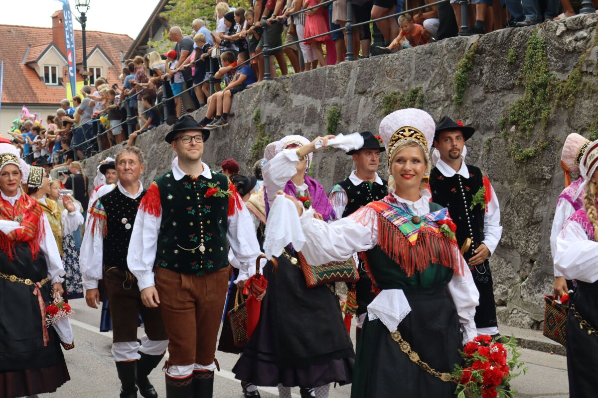 Dopoldan bodo obiskovalce pozdravili pritrkovalci in pihalni orkester, sledi bogat folklorni program s skupinami iz Hrvaške, Latvije, Nemčije in Srbije, ob 15. uri pa veličastna povorka narodnih noš, v kateri se bo predstavilo več kot 2.000 udeležencev iz Slovenije in tujine. Dan bomo sklenili z nastopom Podokničarja in koncertom kamniških narodnozabavnih ansamblov.
