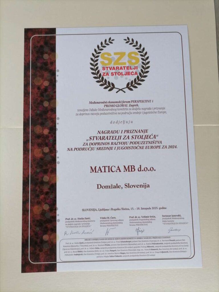 Podjetje Matica MB d.o.o. iz Domžal, s proizvodno enoto v Komendi, je prejelo prestriženo priznanje – Stvaratelji za stoljeća, ki ga podeljuje Svetovni kongres podjetnikov za izjemen prispevek k razvoju podjetništva, inovativnosti in sodelovanja med državami jugovzhodne Evrope.