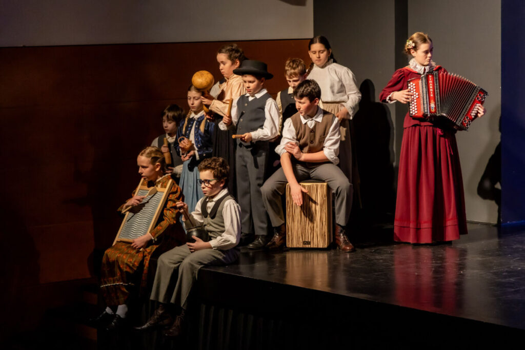 Kot prva je nastopila Otroška folklorna skupina Groblje, ki je bila ustanovljena lani. Otroci so prikazali dogajanje med odmorom. Avtor odrske postavitve in tudi vodja skupine je Franc Hribovšek, glasbene priredbe pa Vlado Podlogar.