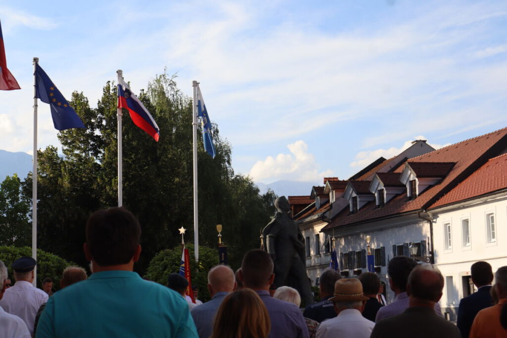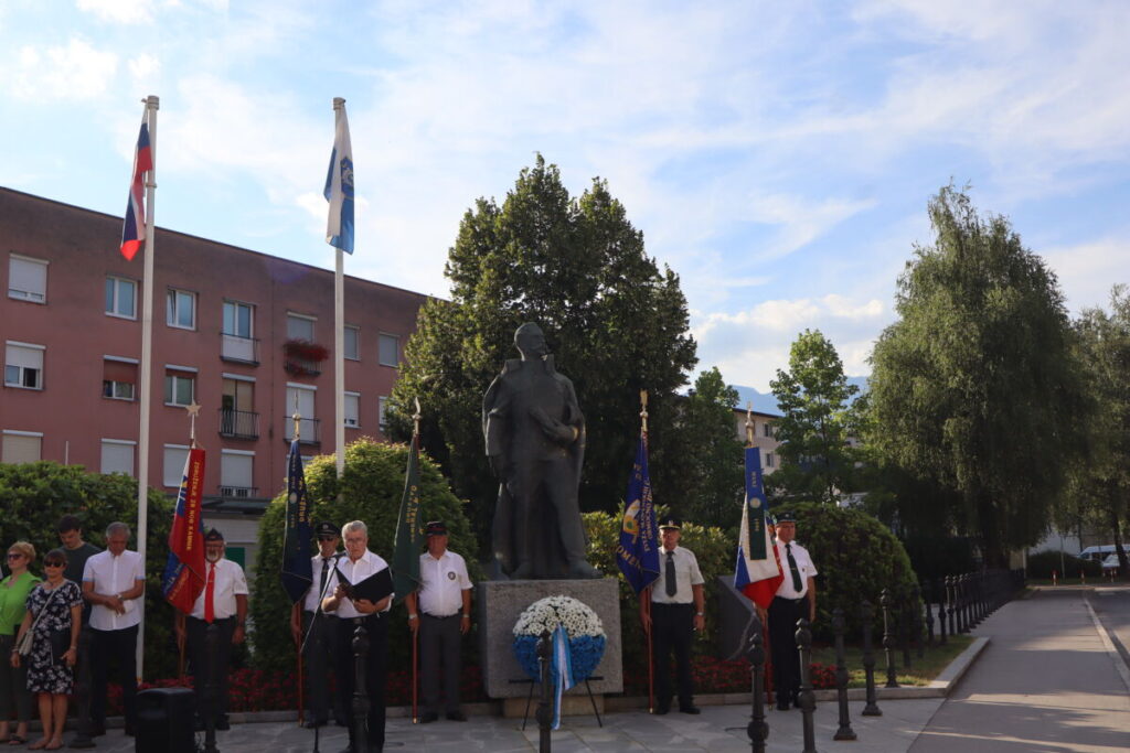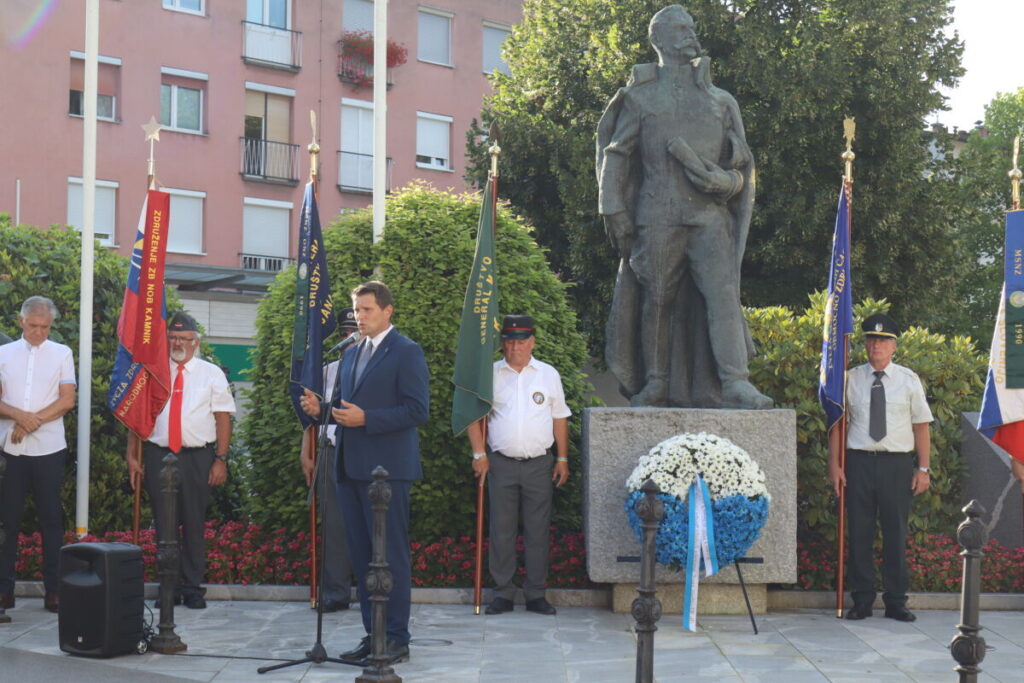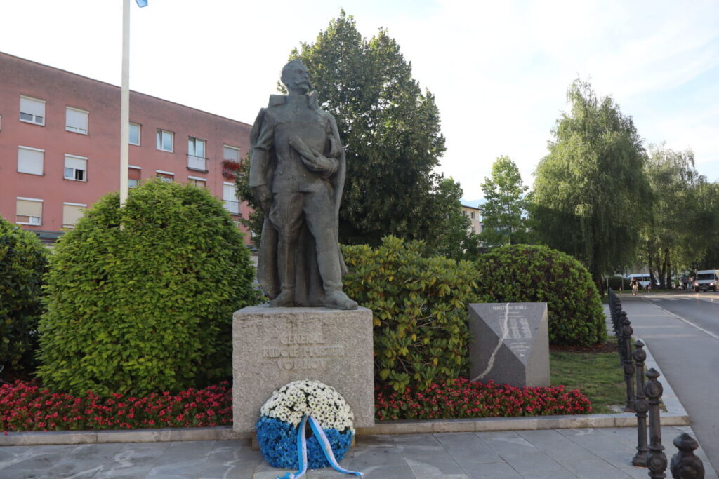 V počastitev 90. obletnice smrti Rudolfa Maistra – Vojanova sta kamniški župan Matej Slapar in predsednik Društva general Maister Jože Berlec v petek, 26. julija, na Trgu talcev v Kamniku svečano položila cvetje.