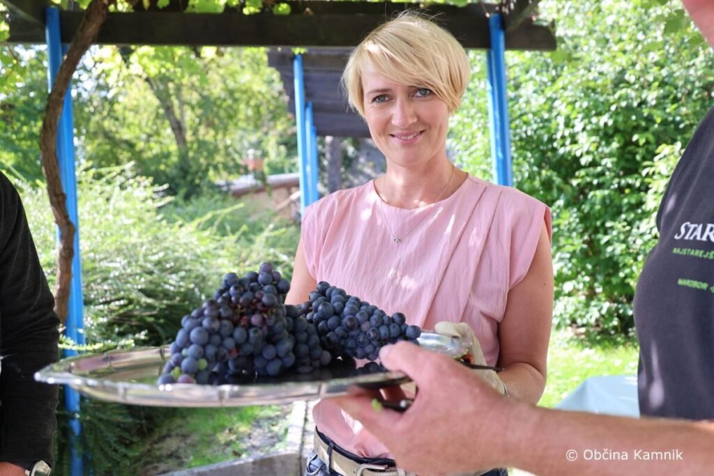 Včeraj je kamniška podžupanja Romana Učakar v Parku Evrope skupaj s svetnico Dragico Požek ter svetnikoma Matijo Podjedom in Miroslavom Bidrom ter viničarjem Mirom Sanaborjem prisostvovala trgatvi potomke mariborske Stare trte, najstarejše vinske trte na svetu.