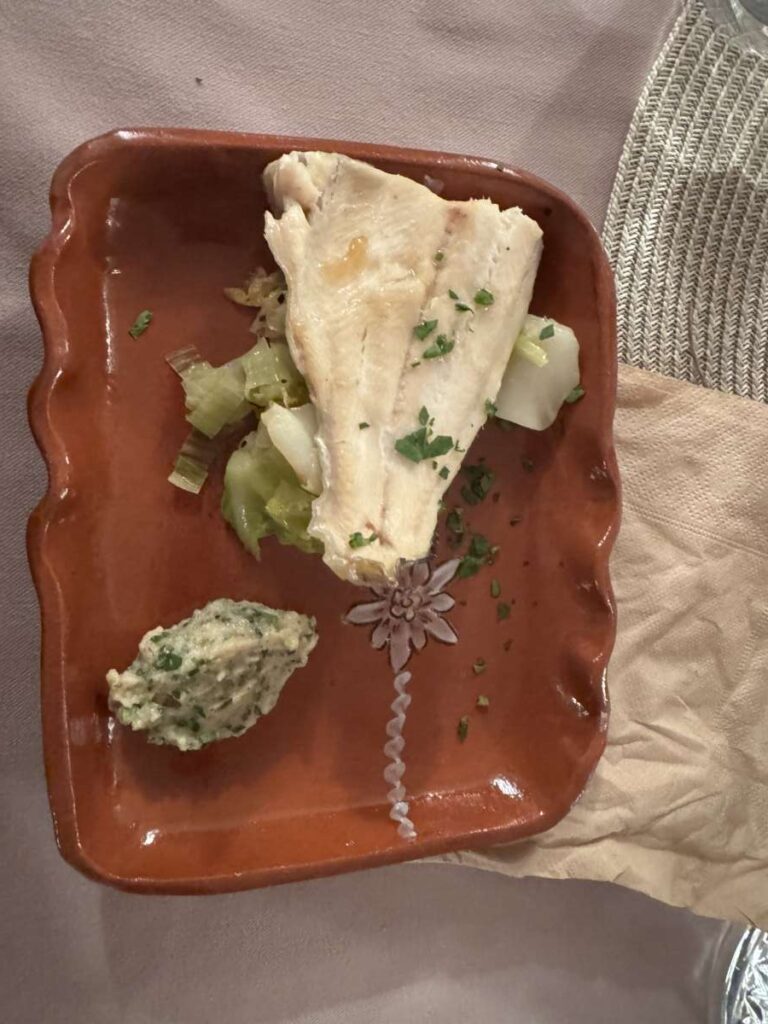 Ob zvokih fanfar je na mizo prispela prva jed – pečena postrv na blanširani in zabeljeni zelenjavi. Sledila je ješprenjeva juha s sušeno čebulo, nato začinjeno piščančje bedro in domača klobasa s hrenom, jajcem ter kašo s kislim zeljem. Za sladico so postregli v vinu kuhane fige z mandljevim prelivom, za zaključek pa še sirno ploščo s suhimi slivami. Pred vsakim hodom so gostje izvedeli nekaj več o jedeh, pa tudi o Starem gradu, ki je bil po vsej verjetnosti zgrajen v 12. stoletju, propadati pa je začel po letu 1600.