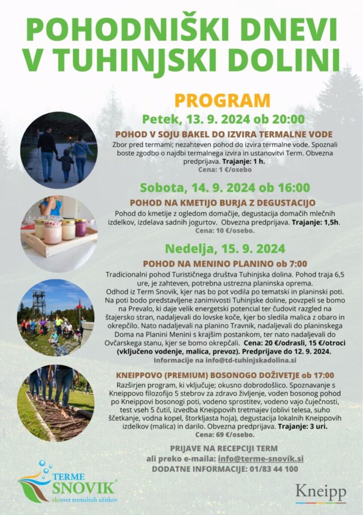 Prvi dogodek bo v petek, ko bo čas za pohod v soju bakel do termalnega izvira. V soboto bo pohod na kmetijo Burja v vasi Snovik z degustacijo in izdelavo sadnih jogurtov. V nedeljo pa bo čas za tradicionalni pohod na Menino planino. Pot bo vodila po tematski in planinski poti. Na poti bodo predstavljene zanimivosti Tuhinjske doline. Na lovski koči bo sledila malica z obaro in okrepčilo. Pohod se bo nadaljeval do Doma na Planini Menini in nato proti Ovčarskemu stanu.
