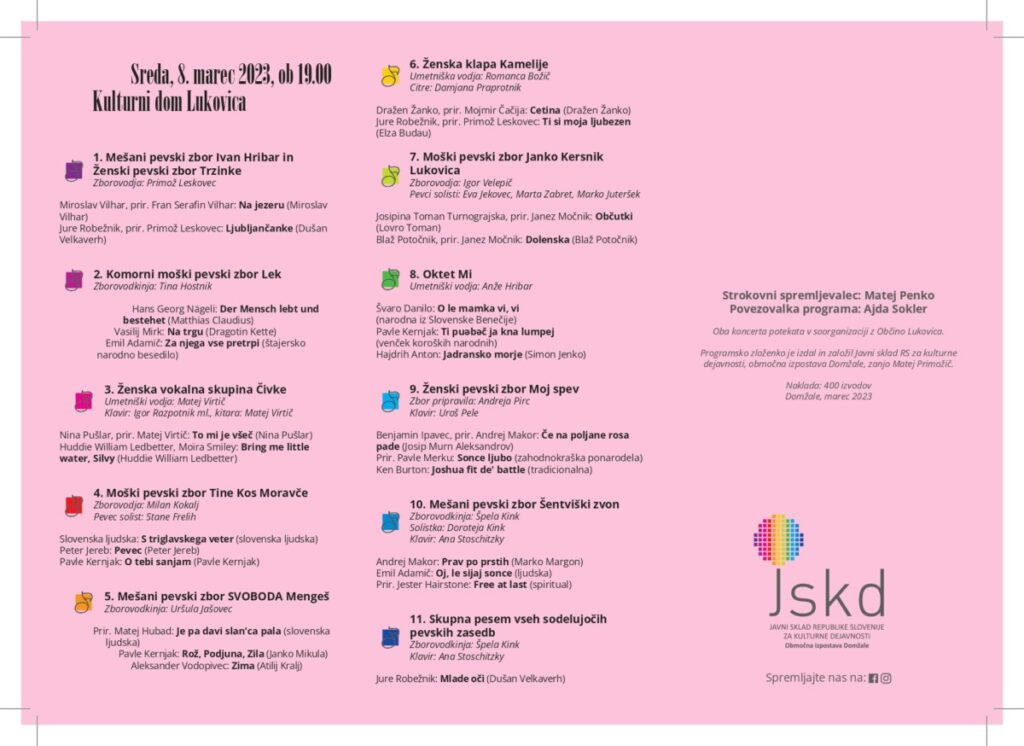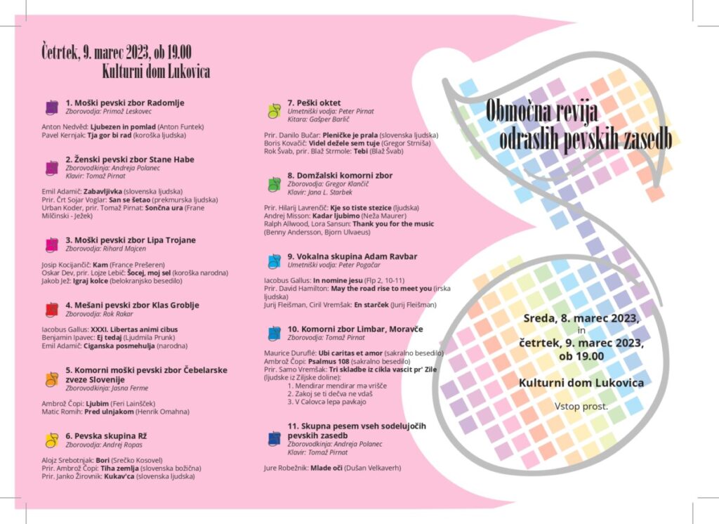 V sredo in četrtek je v Lukovici potekala območna revija pevskih zasedb. Oba večera se je v Kulturnem domu Janka Kersnika predstavilo po deset zborov, ki spadajo pod okrilje JSKD OI Domžale. Številni poslušalci so tako lahko prisluhnili petju raznolikih pesmi, ki nosijo vsaka svojo zgodbo in pomen. Prepletale so se tako ljudske kot umetne pesmi raznolikih svetovnih jezikov, največ je bilo slovenskih.