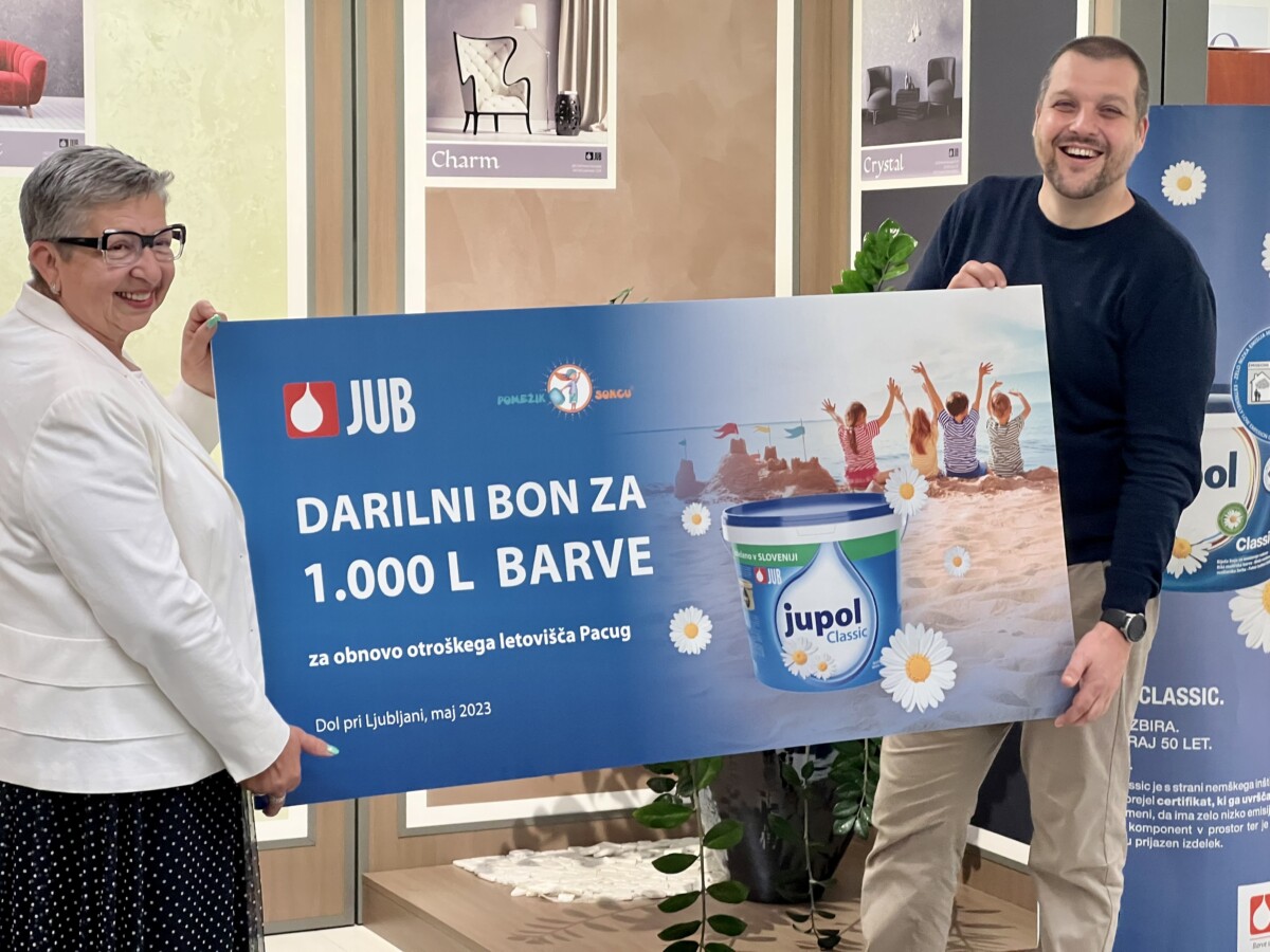V družbi JUB so se tudi letos uspešno povezali z Zvezo prijateljev mladine Slovenije (ZPMS) in v aprilski humanitarni akciji Pomežik soncu® za osvežitev prostorov otroškega obmorskega letovišča Pacug zbrali kar 1.000 litrov barve JUPOL Classic. Za tako uspešen rezultat gre zahvala zvestim JUB-ovim uporabnikom, ki so na spletu pridno reševali zanimive JUPOL izzive ali pa lončke barv zbirali z nakupi 15-litrskih veder barve JUPOL Classic. Ob predaji donacije so v prostorih JUB Design Studia na sedežu podjetja JUB v Dolu pri Ljubljani pripravili kratko slovesnost, na kateri je Željko Kovačevič, izvršni direktor družbe JUB, generalni sekretarki ZPMS Bredi Krašna simbolično predal darilni bon za prenovo letoviških prostorov v Pacugu.
