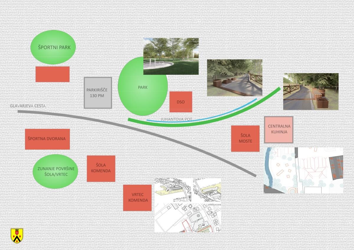 Župan v svoji viziji ureditve tega dela občine ne razmišlja le o rešitvah na južni strani ceste ampak se prostor v celoto zlije šele ob ureditvi prostora na severnem delu reke Pšate in naprej proti Osnovni šoli v Mostah: ”Omenil sem že, kako pomembna je izgradnja Športnega parka in pripadajoče infrastrukture za potrebe vrtca in šole. Občani so tudi že opazili, da smo v neposredni bližini postavili nov paviljon, ki je le prvi od vsebinskih objektov novega parka, ki prinaša dodatne zelene površine na tem mestu. V neposredni bližini imamo Dom starejših občanov, ki omogoča medgeneracijsko druženje otrok, starejših in tudi vseh občanov, ki se redno sprehajajo po Juhantovi poti. Slednja bo v kratkem popolnoma prenovljena in vsebinsko obogatena. Pri tem smo k sodelovanju povabili štipendista Ustanove Petra Pavla Glavarja, ki je pripravil tematske rešitve, ki temeljijo na kulturni dediščini našega kraja. Prepričan sem, da bo s to prenovo Juhantova pot postala še bolj zanimiva in predvsem varnejša za sprehajalce in tudi šolarje, ki vsakodnevno množično uporabljajo to pot. Ta del Komende bo postal srce kraja in mesto druženja za vse občane,” je pojasnil Kern.