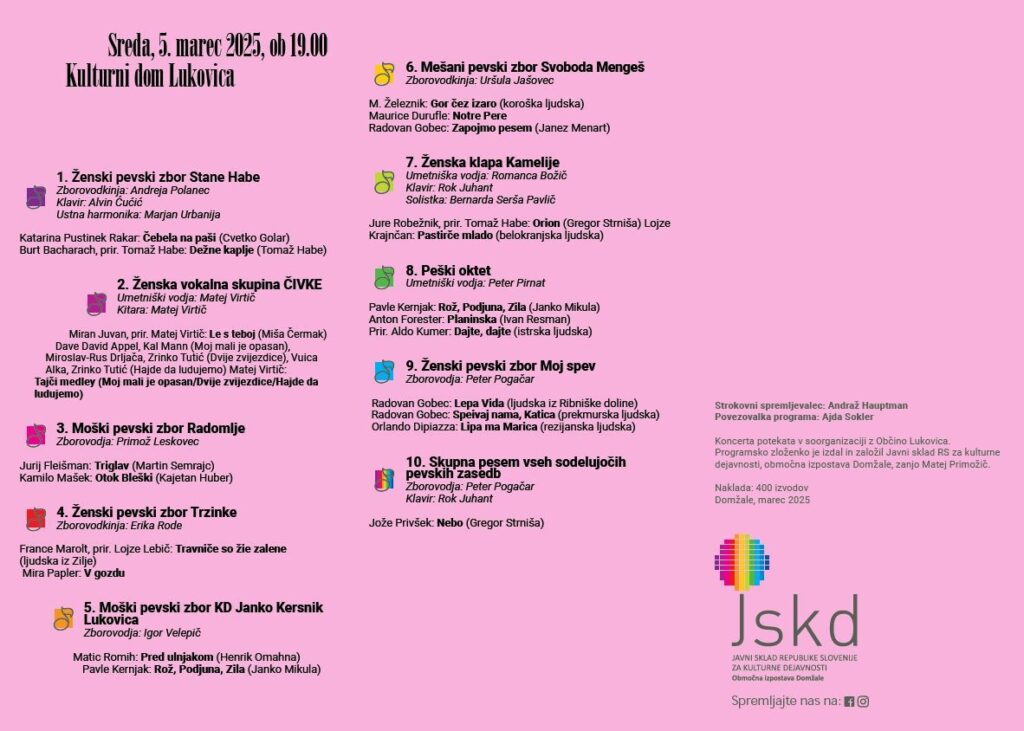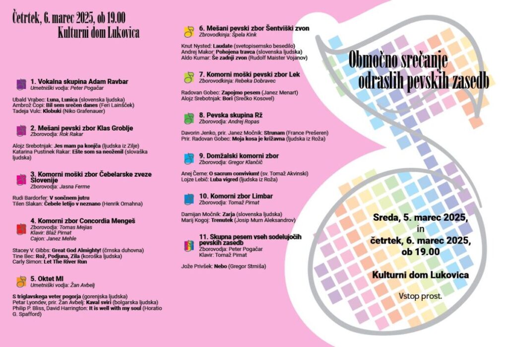 V sredo, 5. marca, in v četrtek, 6. marca, ob 19. uri bo v lukoviškem kulturnem domu potekala območna revija odraslih pevskih zborov in malih pevskih skupin.