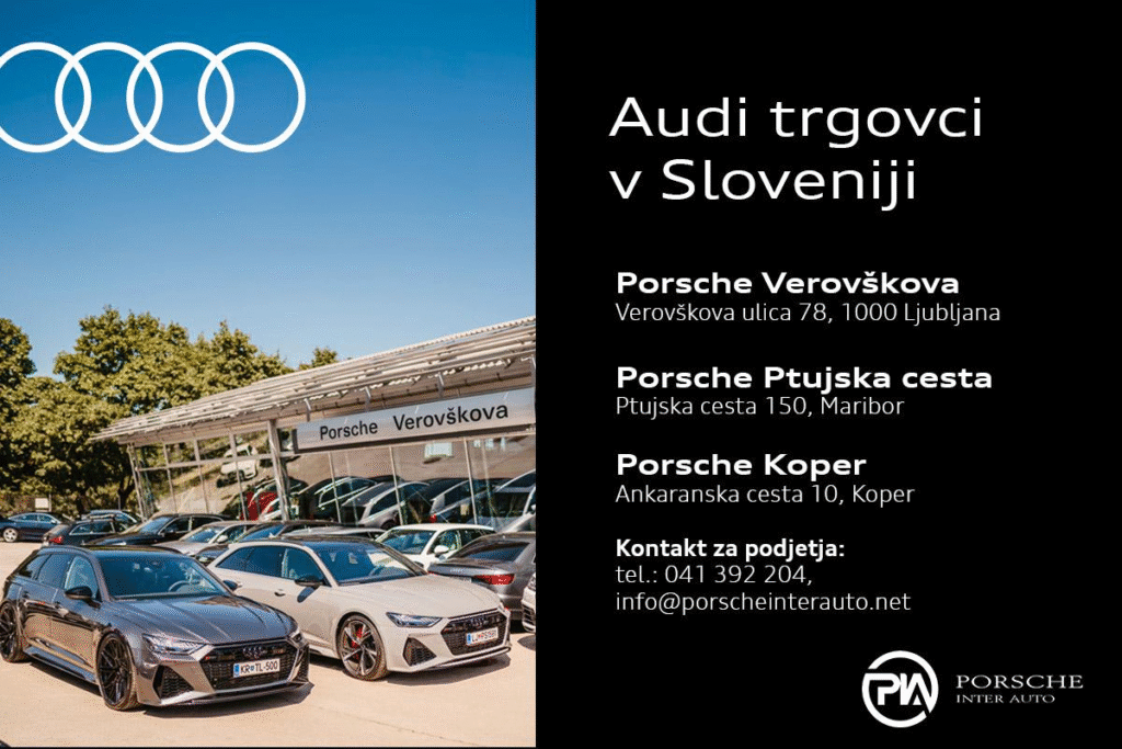 *Strošek kupca v primeru pridobitve nepovratne finančne spodbude s strani Borzena, ki je bila objavljena 2. 9. 2025 v Uradnem listu RS, št. 61/2025. Kupec je dolžan vlogo za pridobitev nepovratnih finančnih sredstev vložiti samostojno. Vse informacije v oglasu vozil glede pridobitve subvencije so zgolj informativne narave in temeljijo na podatkih objavljenih na spletni strani Borzen (javni poziv JP SUB-EV25-1). Podjetje Porsche Inter Auto d. o. o. ne prevzema odgovornosti za točnost, pravilnost in popolnost informacij, objavljenih na spletnih straneh družbe Borzen, kot tudi ne za morebitno neuspešno uveljavljanje pridobitve nepovratne finančne pomoči s strani kupca in to iz katerega koli razloga. Oglaševana cena predstavlja ceno trgovca, družbe PORSCHE INTER AUTO d.o.o., za izbrana oglaševana vozila. Strošek priprave še ni vključen v ceno vozila. Neobvezujoča priporočena maloprodajna cena vozila, v skladu s cenikom neobvezujočih priporočenih maloprodajnih cen distributerja vozil AUDI za slovenski trg, družbe PORSCHE SLOVENIJA d.o.o. je dostopna na na prodajnem mestu. Ponudbe vozil in pogojev nakupa veljajo do 31. 12. 2025. Emisije CO2: 214−0 g/km. Kombinirana poraba goriva: 9,3−4,4 l/100 km. Emisijska stopnja: EURO 6. Emisije NOX: 0,0380−0,0059 g/km. Število delcev: 0,0094−0,0000×1011. Poraba električne energije po kriterijih NEVC v kWh/100 km, komb.: 30,8−13,6 kWh. Emisije CO2 med vožnjo, skupne emisije CO2 so odvisne od vira električne energije. Volkswagen zato priporoča uporabo ekološko pridobljene elektrike.