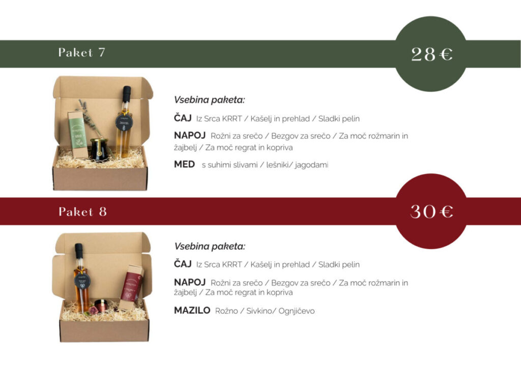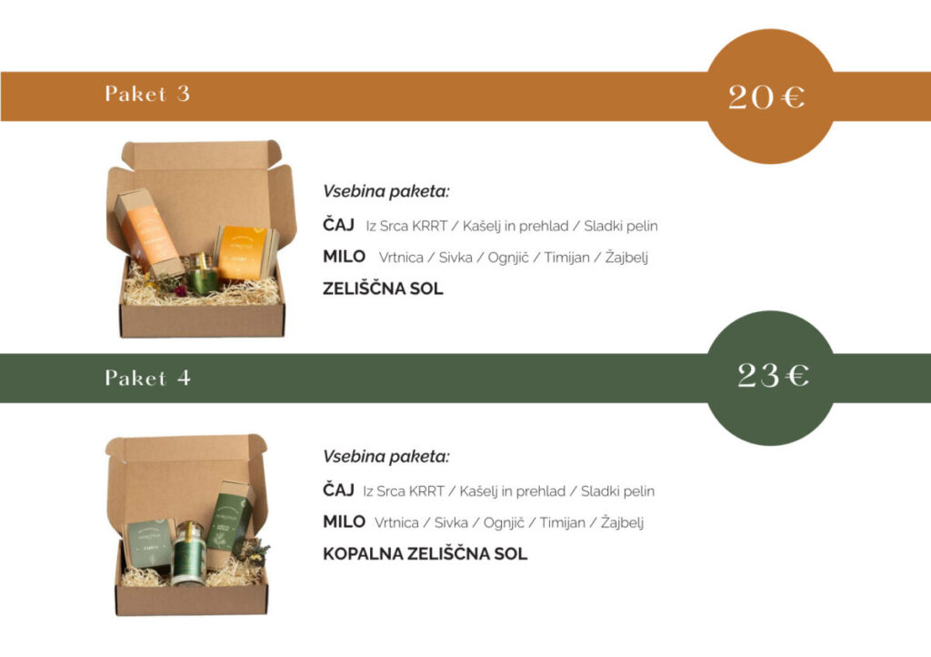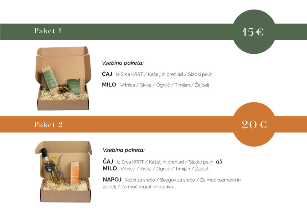 Vsak od devetih paketov ponuja svojo kombinacijo izdelkov iz zelišč, sami lahko zbirate, katera bodo razvesila vašega obdarovanca. V prvem paketu lahko izbirate med različnimi vrstami zdravilnih čajev in med različnimi vrstami mila. Čaj sladki pelin se uporablja za nižanje telesne temperature, za čiščenje jeter, proti vnetjem in kar je še posebej pomembno pozimi, za obrambo organizma pred prehladom in gripo. Čajna mešanica iz zelišč spodbuja delovanje sečil in čiščenje telesa.
