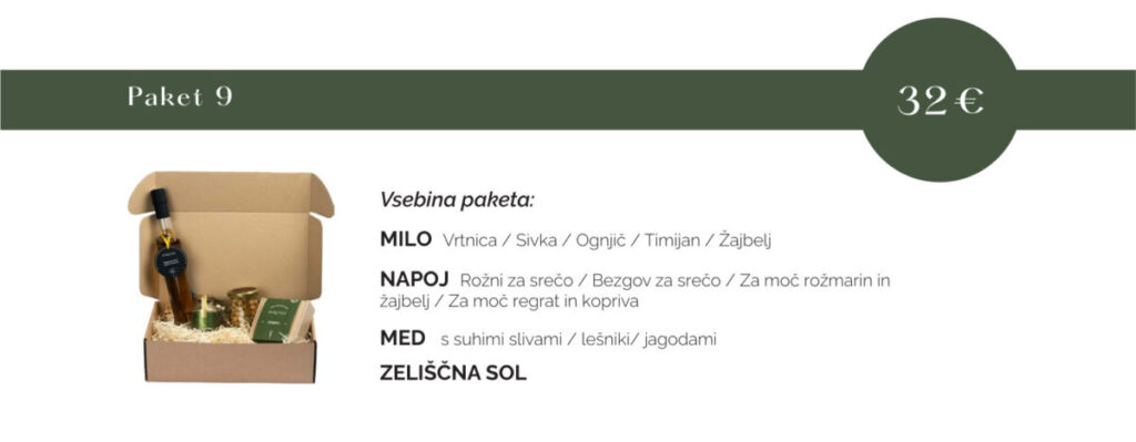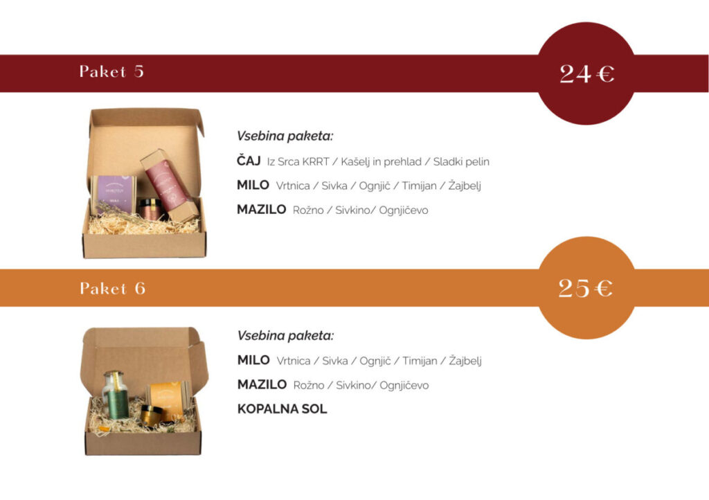 Paket pet so v Samostanu Mekinje sestavili iz čaja, mila in mazila, ki so kot nalašč za nego kože. Ognjičevo mazilo je odličen za nego občutljive, suhe in poškodovane kože, rožno milo pa je primerno za vlaženje kože podnevi in ponoči. S pomočjo sivkinega mazila pa si blažimo kožna vnetja in zdravimo rane. V šestem paketu pa vas poleg mila in mazila čaka še kopalna sol. V sedmem paketu se bodo obdarovanci ob čaju in napoju razveselili medu, ki so ga v samostanu oplemenitili z jagodnimi slivami ali lešniki. Napoj za moč ali srečo je tudi v osmem paketu, poleg tega sta notri še čaj in mazilo. V zadnjem paketu pa vas čaka milo, napoj, med in zeliščna sol.
