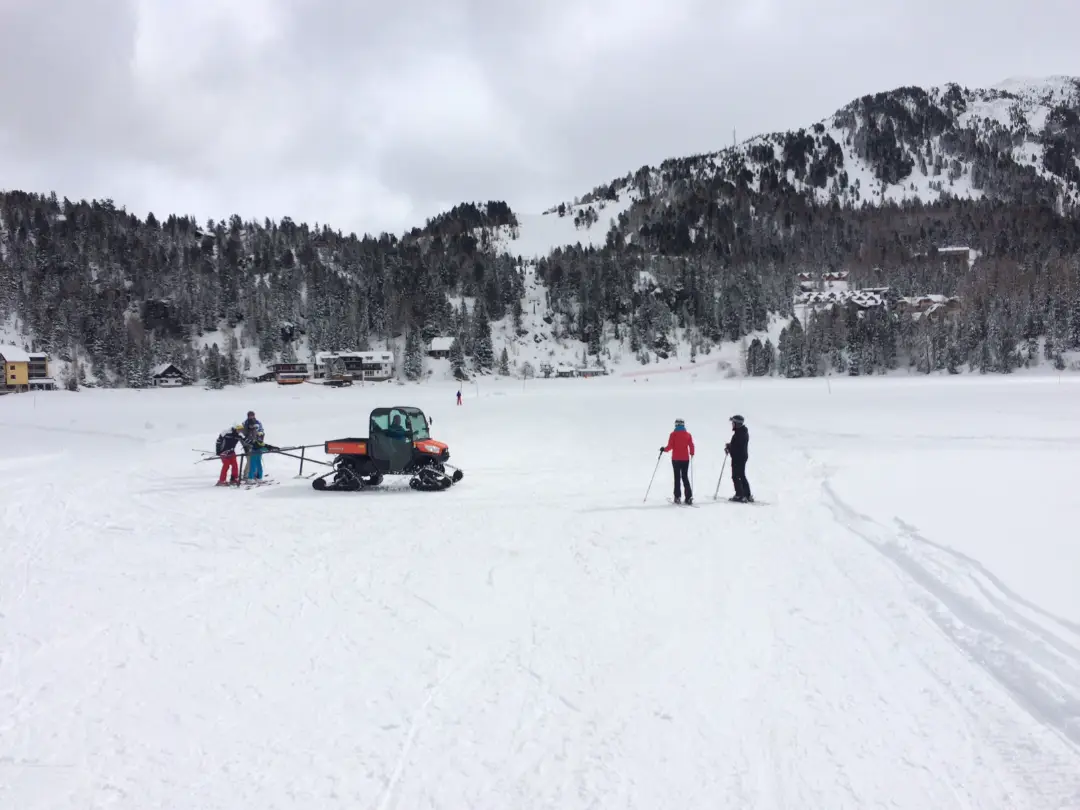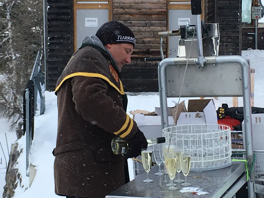 Pa še en bonbonček nas je čakal na vrhu sedežnice. Ob izstopu smo opazili gručo ljudi ob nenavadnem vozičku. Malo smo čudno postopali in opazovali, nato pa le ugotovili, da gospod z napisom “piste butler” brezplačno streže penino.