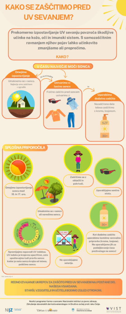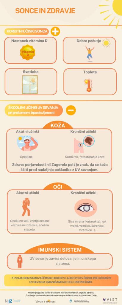 Sonce je vir življenja. Daje nam svetlobo, toploto, omogoča nastanek vitamina D v koži, na soncu se dobro počutimo. Vendar, bodimo previdni! Prekomerna izpostavljenost ultravijoličnemu (UV) sevanju (sončnemu ali umetnih virov npr. solariju) povzroča prezgodnje staranje kože in je glavni dejavnik tveganja za pojav vseh vrst kožnega raka. Akutne in kronične/odložene škodljive učinke povzroča tudi na očeh in imunskem sistemu.