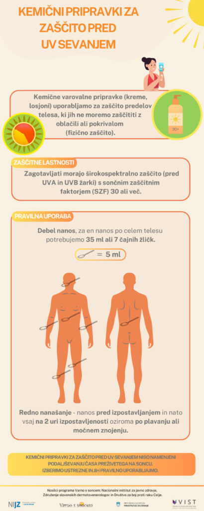 Oblecimo primerna oblačila in pokrivala. Zaščitimo oči s sončnimi očali in pokrivalom. Na delih telesa, ki jih ne moremo zaščiti z obleko, uporabimo kemične varovalne pripravke (kreme, losjoni).