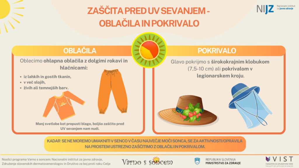 Omejimo izpostavljanje soncu v času njegove največje moči, poleti med 10. in 17. uro. Aktivnosti na prostem opravimo prej ali potem.